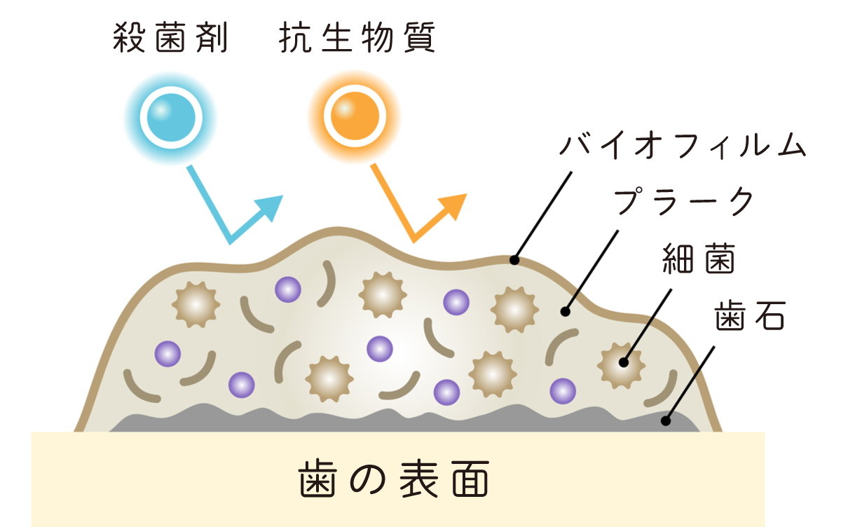 バイオフィルムは非常に強固な構造体として物理的に除去するのが困難であり、殺菌剤や抗生物質などによる歯の表面のプラーク除去は困難です。